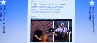 Même si nous attachons la plus grande importance à la qualité du travail, notre jeune site ne s’attendait pas à une telle « mise à la une ». Notre article sur le chanteur américain Joe Flood a été reblogué par l’ambassade des Etats-Unis à Paris (lien : https://twitter.com/USEmbassyFrance/status/527490341335601152). Rien que ça ! C’est d’autant plus gratifiant que MaghNord tient à l’indépendance totale de sa ligne éditoriale. Nous remercions les services culturels de la représentation diplomatique américaine pour une telle attention.