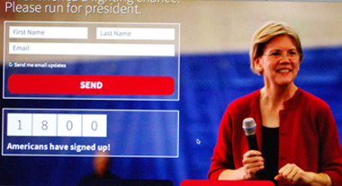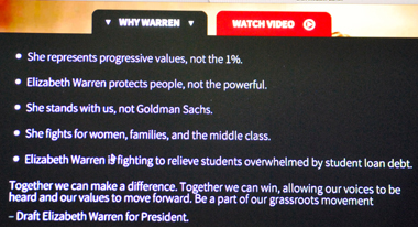 Selon la plate-forme du collectif, la sénatrice du Massachusetts « représente une valeur montante et non le 1% (ndlr. de la société) », catégorie de notables dont ils accusent Hillary Clinton de défendre les intérêts. Le reste de cette pré-campagne se déroule sous des mots d’ordre du genre : « Elizabeth Warren protège le peuple, non le pouvoir », « Elle sera à nos côtés, pas avec Goldman Sachs », « Elle se bât pour les femmes, les familles et les classes moyennes », « Elizabeth Warren se bât pour les étudiants criblés de dettes liées aux prêts étudiants »…