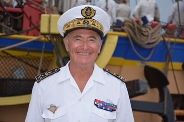 L’amiral Hubert Pinon ne cache pas sa joie de voir le pavillon français de retour à Newport (photo Dahmane Soudani)