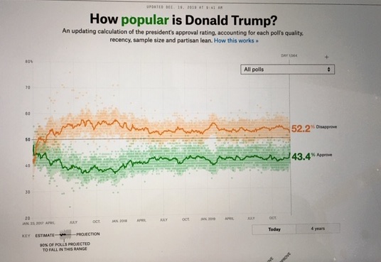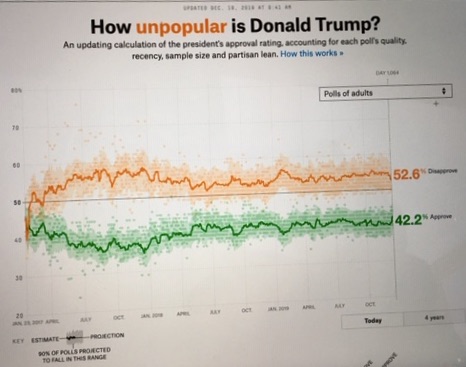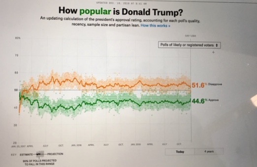 Alors le 6 septembre 2018, il ne bénéficiait que 41,4% d’opinions favorables, en septembre 2019, au lendemain du lancement de la procédure de destitution, il a amélioré son score de près de 1,5 point se hissant 42,8% d’opinions favorables et immédiatement après l’adoption de la procédure de révocation de mercredi dernier, sa cote a encore grimpé pour atteindre 43,4% d’opinions favorables -44,6% chez les électeurs inscrits sur les registres de vote- (1).
