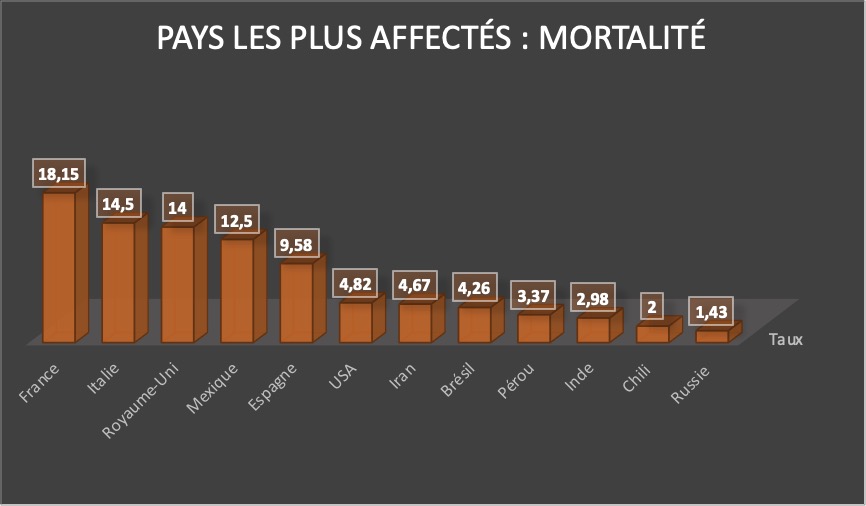 À ce jour, dans ce groupe de nations, la France reste le pays qui enregistre le taux de mortalité, liée à la covid-19 (létalité), le plus élevé. Il est de 18,15%. Depuis début mai, le pays semble néanmoins surmonter la crise. Viennent ensuite, l’Italie (14,5%), le Royaume-Uni (14%), le Mexique (12,29%) et l’Espagne (9,58%)