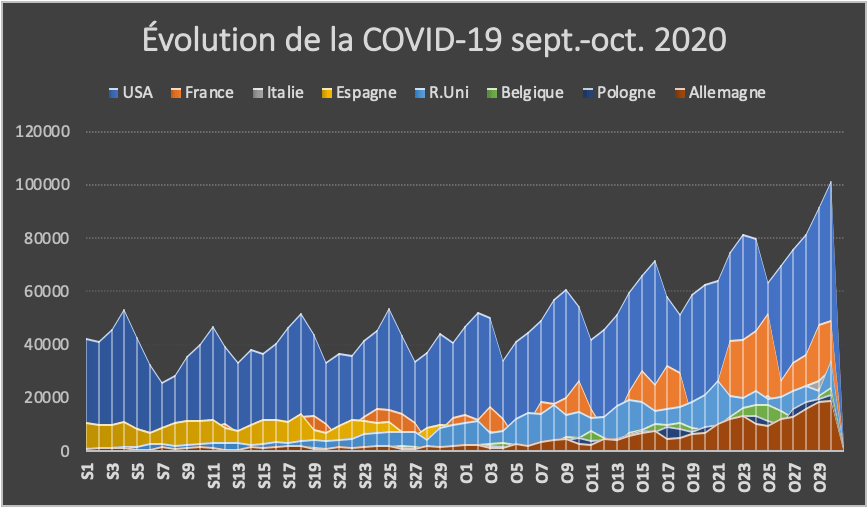 Nous n’avons pas pris en compte les données du 31 octobre 2020, parce qu’au moment où nous mettions cet article en ligne, les informations concernant l’Espagne, pour cette journée, n’étaient pas disponibles.