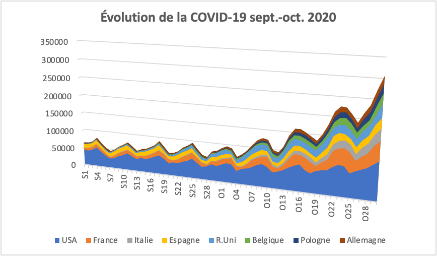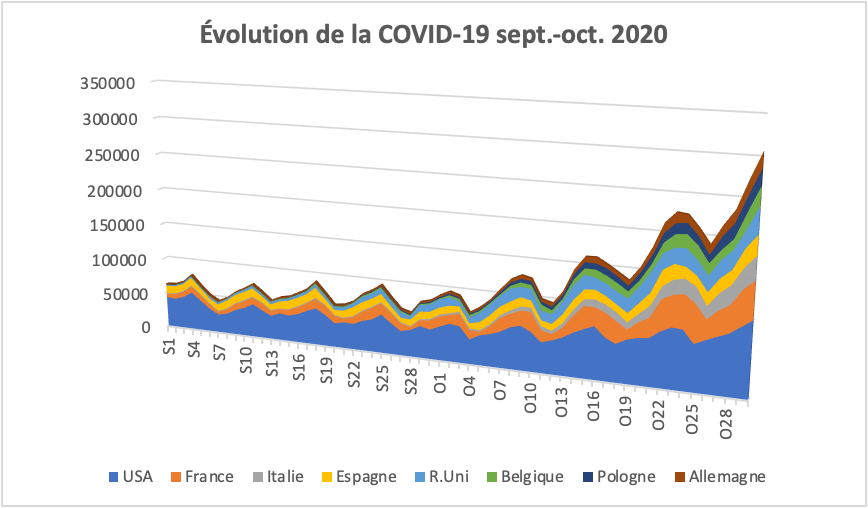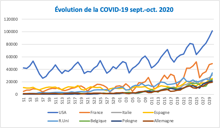 Comment expliquer, par exemple ces envolées de cas confirmés autour des dates des 15, 17 et 25 septembre et de celles des 2, 9, 16, 24 et 29 octobre. Comment expliquer également cette ressemblance entre des pays comme la France et les États-Unis, le Royaume-Uni et la France, les États-Unis et le Royaume-Uni ou encore entre la Belgique, voire la Pologne et les États-Unis, parfois séparés par des milliers de kilomètres ?