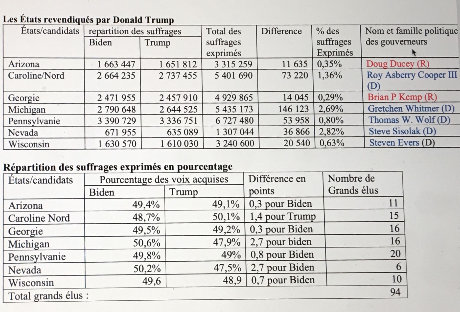 À l’heure où nous mettions en ligne, Joe Biden comptait 290 grands électeurs et Donald Trump 217. Or, pour gagner cette élection, l’un des deux candidats devait s’allier 270 de ces délégués. Comme indiqué plus haut, en raison des vérifications, la Géorgie (16 grands élus) et la Caroline du Nord (15 grands élus) n’ont pas encore officiellement déclaré leurs résultats. Or, outre ces deux États, l’équipe de campagne de Donald Trump revendique la victoire en Arizona, Michigan, Pennsylvanie, Nevada et Wisconsin soit un cumul de 94 grands élus dont 63 sont déjà portés sur le bilan de Joe Biden. À l’exception du Nevada, tous ces États ont été gagnés, en 2016, par le président sortant.