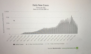 Dans le monde, après le pic du 8 janvier dernier, journée au cours de laquelle on a enregistré 845 696 cas confirmés, le nombre de quotidien de patients contaminés est en baisse constante avec néanmoins quelques rebondissements. Le 14 février courant, le nombre de personne infectées a dégringolé à 304 469 cas (-64%), légèrement moins que celui du 6 octobre dernier (314 899 cas) date à partir de laquelle la situation semblait hors de toute maitrise possible.