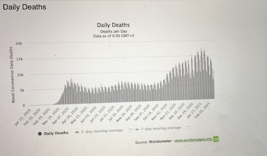 Le nombre de morts attribués à la Covid-19 a, lui aussi suivi la même tendance. En la matière, depuis le début de la pandémie, la journée la plus meurtrière fut celle du 20 janvier 2021 avec un très lourd bilan quotidien de 17 598 décès. Ce mardi 15 février on a enregistré seulement 6 700 morts (-62%), légèrement moins que de bilan du 8 octobre dernier, date à partir de laquelle la courbe a, là aussi, commencé à s’emballer.