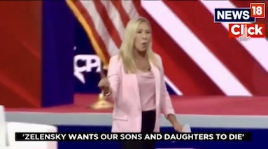De son côté, Marjorie Taylor Greene, la représentante, républicaine (14e district de Géorgie), proche de Donald Trump, qui, le 3 novembre dernier, promis que si les Républicains prenaient le contrôle du Congrès plus un sou de plus ne serait dépensé pour l’Ukraine, a tancé : « Zelensky veut que nos fils et nos filles meurent (…) Il vaut mieux garder vos mains loin de fils et filles parce qu’ils n’iront pas mourir là-bas » (6). Cette vidéo a été supprimée par Youtube et remplacée par l’annonce laconique « Cette vidéo n’est plus disponible ». Reste que ce document audiovisuel est toujours disponible sur le site de News 18 qui en est le producteur initial.