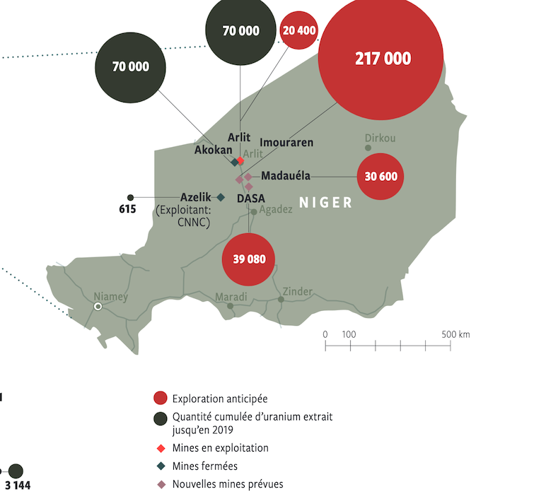C’est d’autant plus tragique que, selon le Réseau sortir du nucléaire, « Après 50 ans d’exploitation, le bilan est édifiant. Le Niger n’a récupéré qu’environ 12 % (NDLR. 5% selon d’autres sources) de la valeur de l’uranium produit et n’a jamais quitté le podium des trois pays les plus pauvres de la planète ». « L’uranium nigérien a pourtant contribué pour un tiers à la production d’électricité de la France, jouant un rôle non négligeable dans son développement économique et industriel. Et si la société Areva possède des mines dans d’autres pays, la France reste en revanche dépendante à 100 % de l’uranium du Niger pour son programme militaire », ajoute le Réseau (in Atlas de l’uranium).