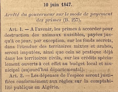 À partir de l’été 1847, les primes de destruction seront, à l’instar des territoires dits « civils » rétribuées sur « les crédits spécialement ouverts à cet effet au budget local et municipal (aujourd’hui départemental) ». En dépit de son caractère dévastateur et injustifié, cette décision a pour avantage de permettre, à travers l’exploitation des archives financières, de connaitre le nombre d’animaux tués.