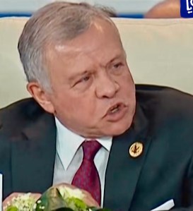 Le roi de Jordanie participait au sommet du Caire de ce samedi. L’air grave, il martèle d’entrée de jeu : « Le message que le monde arabe entend est fort et clair. La vie des Palestiniens compte moins que celle des Israéliens. Nos vies comptent moins que celles des autres. L’application du droit international est optionnelle et les droits de l’homme ont des limites. Ils s’arrêtent aux frontières. Ils s’arrêtent aux races et aux religions. » Et le roi Abdallah II d’avertir : « Il s’agit d’un message très, très dangereux, car les conséquences d’une apathie et d’une inaction internationales persistantes seront catastrophiques pour nous tous ».