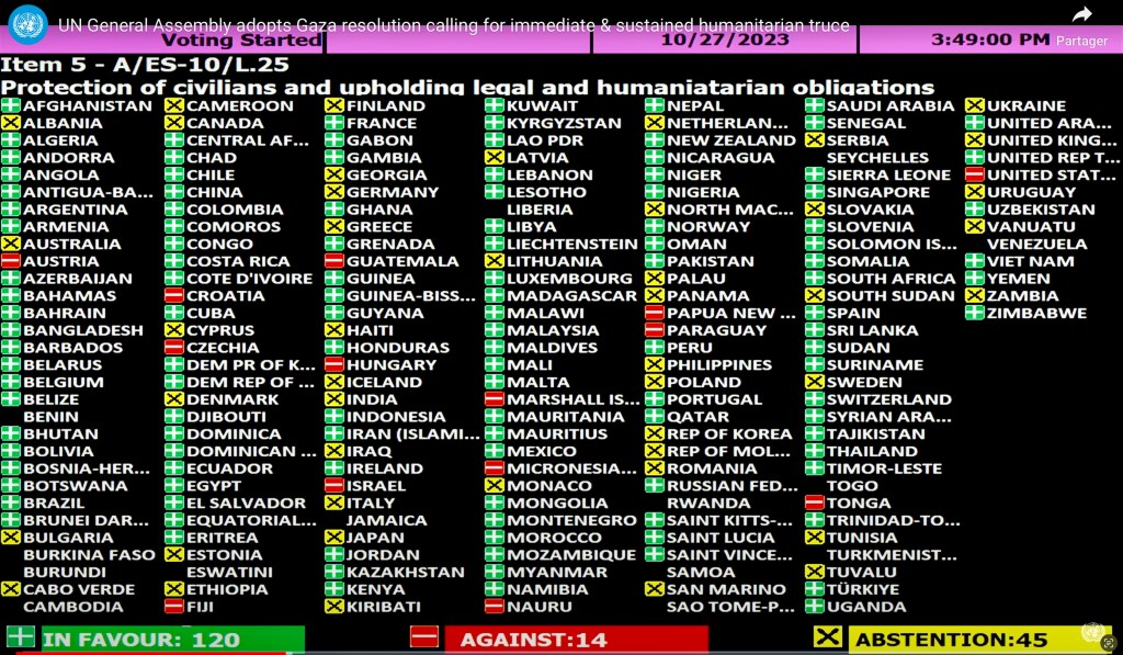 Cette résolution dite « Protection des civils et respect des obligations juridiques et humanitaires » a été voté par 120 pays (67,1%) contre 14 et 45 abstentions. Trois membres permanents du Conseil de sécurité -La Chine, La France et La Russie- ont voté pour. Le Royaume-Uni s’est abstenu.