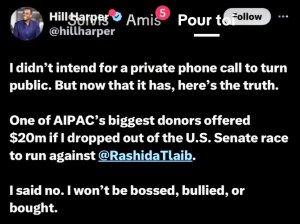 Le premier candidat contacté est l’acteur Hill Harper. Celui-ci s’est fendu d’un tweet en ces termes : « Je n’avais pas l’intention qu’un appel téléphonique privé devienne public. Mais maintenant que c’est le cas, voici la vérité. L’un des plus gros donateurs de l’AIPAC m’a offert 20 dollars si j’abandonne la course au Sénat américain pour me présenter contre Rachida Tlaib. J’ai dit non, je ne serai pas intimidé ni acheté »