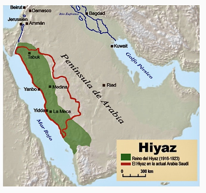 (2). En 1916, Pour éloigner la dynastie Hachémite du Hidjaz, les Anglais, soutenus par les Français, les ont poussés à se soulever contre les Ottomans en leur faisant miroiter le Royaume arabe de Syrie (RAS) qui englobe la Syrie actuelle, le Liban et la Jordanie. En 1916, l’Empire ottoman s’effondre et en 1920, Fayçal 1er, le troisième enfant de Hussein ben Ali al-Hashimi est installé à Damas à la tête du RAS et son père devient roi du Hidjaz. Mais les Anglais qui ne voulaient d’un pouvoir avec une assise solide, trahissent les Hachémites en aidant les Ibn Saoud à prendre le pouvoir. Ces derniers prennent la Mecque en 1925 et mettent fin à mille ans de chérifat hachémite.