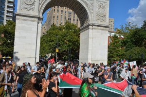 Au milieu d’une forêt de drapeaux palestiniens, de pancartes, d’écriteaux et de divers supports, ils étaient surtout des jeunes de tous horizons, en habits modernes, en tenues traditionnelles, apparentées à diverses cultures et/ou religions, donnant de la voix à une cause qu’ils ont choisi de défendre par ce Labor Day. Avant que le cortège ne se mette en mouvement, c’était l’heure de la prière du Dohr. Les Musulmans pratiquants accomplissent alors ce devoir en formulant des vœux pour la Palestine. En dépit de cette diversité, ils étaient tous unis par la nécessité de rendre justice au peuple Palestinien. Même la monture du monument dédié à George Washington s’est vu flanquer de l’emblème de la patrie de Yasser Arafat. Les plus chanceux des manifestants ont pu participer à étaler et/ou porter un gigantesque drapeau palestinien, en la circonstance vénéré et entouré d’une attention toute particulière, voire d’affection. Le cortège était si imposant qu’il était impossible pour les manifestants de scander un slogan unique. Finalement chacun des carrés, quoi que bien encadrés, en avait le sien.