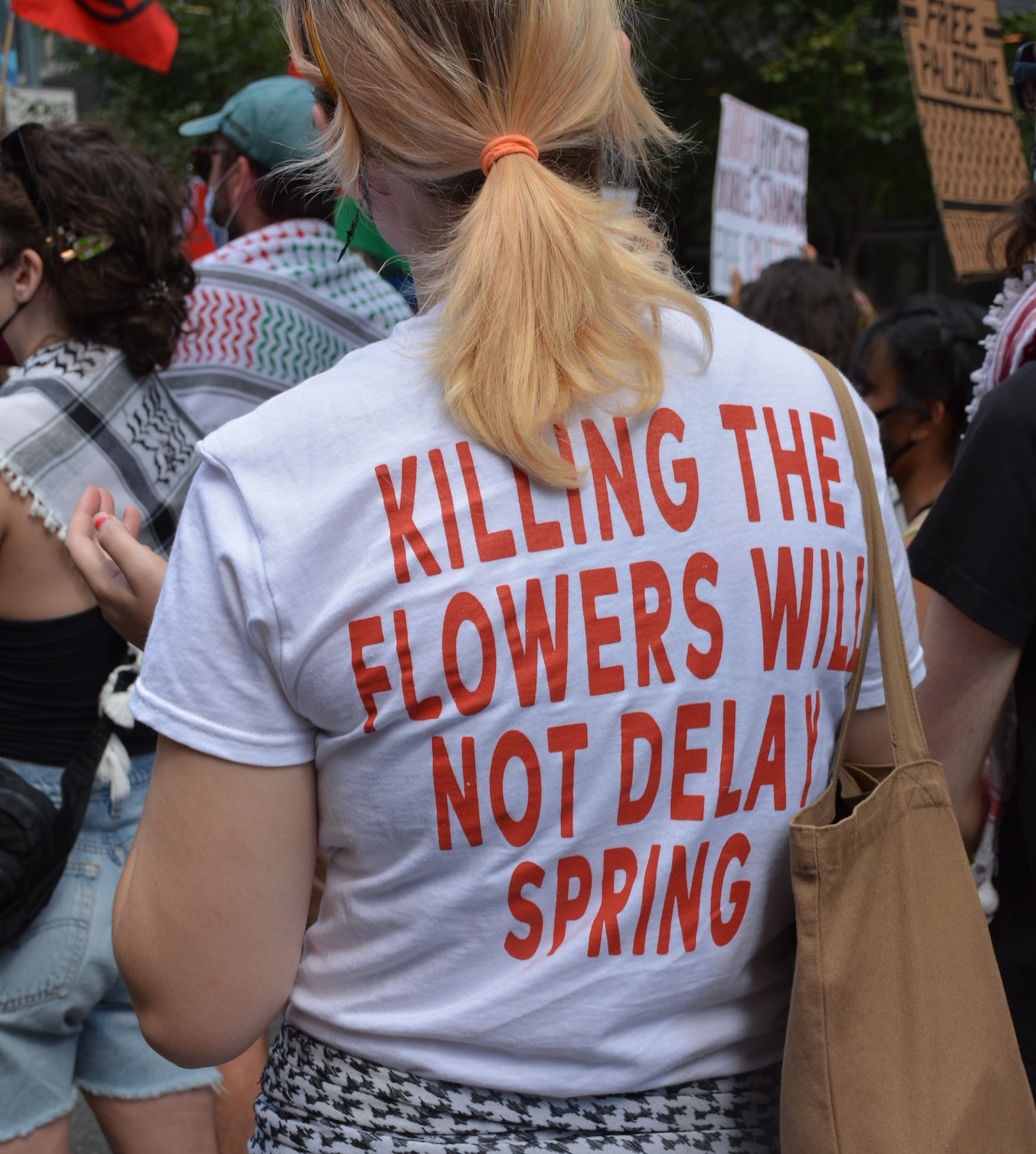 En tête de cortège, on observe des banderoles déployant des slogans comme « Pas de vote pour le génocide : résister pour la Palestine », « Mondialisons l’Intifada » de Within Our Lifetime for Palestine[1], « Durant toute notre vie unis pour la Palestine », de Résistance jusqu’au retour[2], « Les professionnels de la santé unis pour la Palestine libre », signés des Travailleurs de la santé de New York pour la Palestine[3], « Aucune fierté dans le génocide » et « Silence = mort », non apparentés.