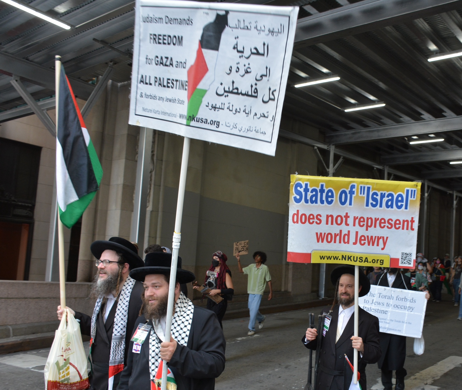 Comme dans la quasi-totalité des manifestations pour la Palestine, la participation de personnes ou d’organisations de confession juive est de plus en plus importante. La plus visible est celle des juifs orthodoxes affiliés à Neturei Karta [4]. Sur leurs pancartes, ils arborent des dénonciations telles que : « La Torah interdit aux Juifs d’occuper la Palestine », « Israël est responsable de 76 années du sang versé des Arabes et des Juifs », « Les Juifs soutiennent les étudiants : L’antisionisme n’est pas de l’antisémitisme » « L’État d’Israël ne représente pas la communauté juive mondiale », « Le judaïsme exige la liberté pour Gaza et pour toute la Palestine et interdit tout État juif » ou encore « Le judaïsme condamne l’État d’Israël et ses atrocités ». Ce groupe est la cible de prédilection des harceleurs pro-israéliens dont les propos, à leur adresse, sont des plus triviaux. La solidarité de tous les manifestants a, à chaque fois, repoussé avec succès, ces provocateurs, mais à la fin de la manifestation d’hier, il a fallu que la police new-yorkaise s’interpose et éloigne les perturbateurs.