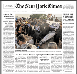 Ce gommage d’une réalité qui, par son actualité et sa proximité crève les yeux et les oreilles, est comblé par des platitudes entourant le ventre de la « une » du genre : « Netanyahou promet de garder le contrôle de la frontière avec Gaza » (la force efface le crime), « Biden en soutien, Harris courtise les électeurs syndiqués » (proche des gens simples) et « Le livre que le Hamas a écrit sur la lutte contre les forces israéliennes dans la clandestinité » (des méchants qui frappent dans le dos).