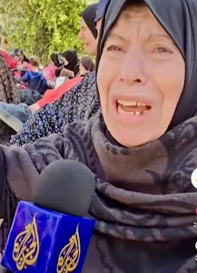 « Ils sont arrivés en nous bombardant et en nous tirant dessus. Ils ont arrêté nos enfants. Certains ont été tués. Ils nous ont jetées dans la rue, sans nos enfants et sans nos hommes. Nous ne savons pas où aller. Nous ne savons pas que faire. Au moment où je vous parle, nous ne savons pas ce que sont devenus nos enfants. Des enfants, pourquoi déchiqueter nos enfants. Sous nos yeux nos enfants ont été mutilés. Qu’ont-ils fait, ces enfants, pour être tyrannisés de la sorte. Ils nous ont déplacés en nous tirant dessus, en utilisant les gaz, en brûlant nos maisons, nos abris et tous les lieux de vie. Ils ont sacrifié nos filles, nos petits. On ne retrouve plus nos enfants. Où sont nos enfants ? réveillez-vous ! aidez-nous ! Ça suffit comme ça ! » s’insurge une dame au micro d’Anis asharif.
