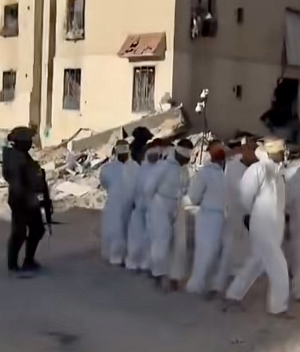 Dans un autre reportage, Sky News montre des hommes habillés en blanc, pieds nus, les mains attachées derrière le dos, les yeux bandés, encadrés par des militaires lourdement armés qui les conduisent vers un lieu inconnu.