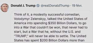 Dans un post daté du 19 février courant, publié sur la plateforme « X », le président américain Donald Trump étrille le dirigeant, de fait, de l’Ukraine Volodymyr Zélensky. « Vous rendez-vous compte, un comédien au succès modeste, Volodymyr Zélensky, a convaincu les États-Unis d’Amérique de dépenser 350 milliards de dollars pour entrer dans une guerre qui ne pouvait pas être gagnée » commence par alerter le locataire de la Maison-Blanche, décidément en verve. Pour donner un ordre d’idée, 350 milliards de dollars, c’est presque le PIB du Qatar, la 52e économie du monde (données de 2018). Cette guerre « n’aurait jamais dû commencer, mais (c’est) une guerre qu’il ne pourra jamais régler sans les États-Unis et « TRUMP » », tance le président avant de déplorer : « Les États-Unis ont dépensé 200 milliards de dollars de plus que l’Europe, et l’argent de l’Europe est garanti, tandis que les États-Unis ne recevront rien en retour ». Et Donald Trump de s’interroger : « Pourquoi Joe Biden, l’endormi, n’a-t-il pas exigé la péréquation (équivalence), alors que cette guerre est bien plus importante pour l’Europe que pour nous » et que « nous avons un grand et magnifique océan comme séparation ? »