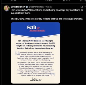 C’est une première ! Le parlementaire démocrate américain du Massachusetts, à la Chambre des représentants, Seth Wilbur Moulton, plus connu sous le nom de Seth Moulton (47 ans) vient d’annoncer, sur la plateforme X, qu’il restitue les dons qu’il avait reçus du groupe de pression pro-israélien AIPAC. Selon le site OpenSecrets, en 2023 et 2024, ce représentant avaient reçu 42 850 dollars. Cette restitution n’est pas un fait anodin et va poser de sérieux problème aux groupes de lobbying pro-israélien qui jusqu’à présent, faisaient la pluie et le beau temps.